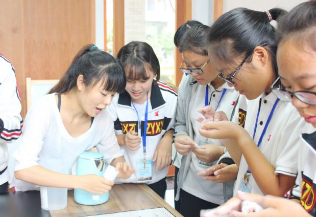 “这段视频合成我们需要用到四个轨道……”“老师,冰皮月饼皮的厚度这样可以么……”“来,我们一起再把这五个音唱一遍……”“老师,你看我做的小黄人怎样……”“How can I speak English betterMiss Sarah……”中午时分,绍兴中专“快乐大本营”学生社团教室中,欢声笑语不断,气氛热火朝天。