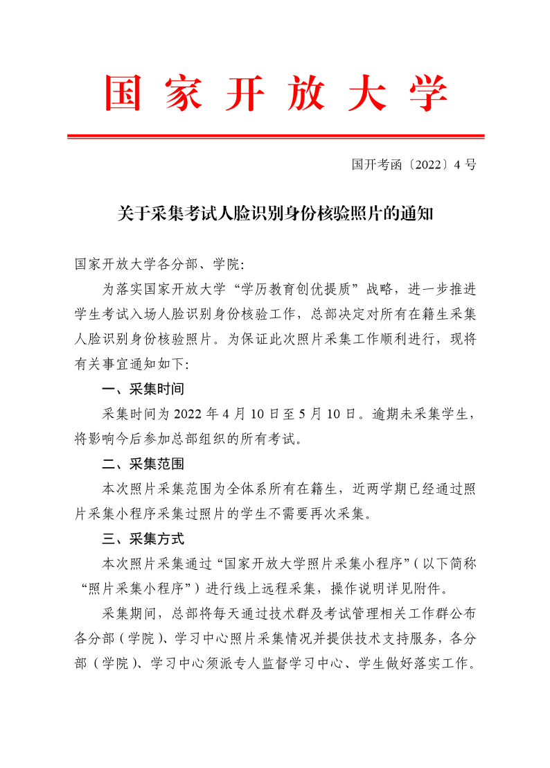 国家开放大学关于采集考试人脸识别身份核验照片的通知
