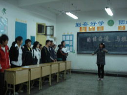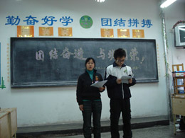 2008年12月4日下午,为了促进班级的团结,增进同学之间的友谊,激励学生奋发向上的斗志,我班举行的“团结奋进,与班同荣”的全校观摩主题班会。